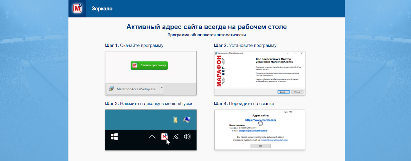 На территории РФ основной домен БК может блокироваться. На этот случай Марафон официально предоставляет зеркала — сайты-дубли, где сохранены: